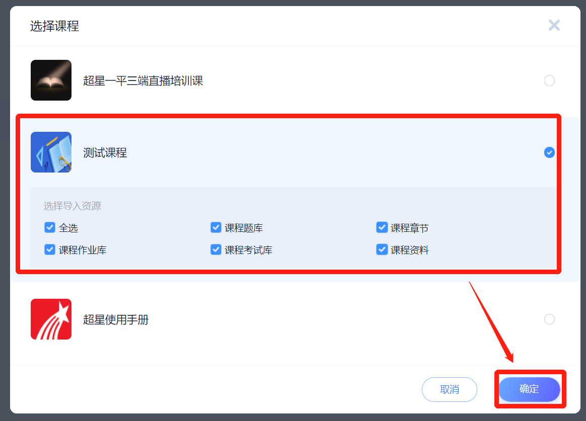 选择要导入的课程,课程选择范围为“我教的课”,可以选择对应的课程的章节、题库、作业库、试卷库、资料等模块进行导入。
