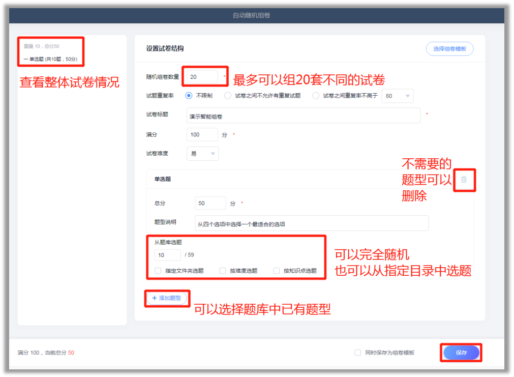 ③设置完成后,点击页面下保存,组卷完成。如果填写内容有误,系统会有标红提示,修改后再次点击保存。