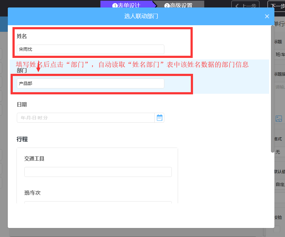 1. 选择关联表;2.设置条件字段;3.设置联动显示关联表里的哪个字段的值。