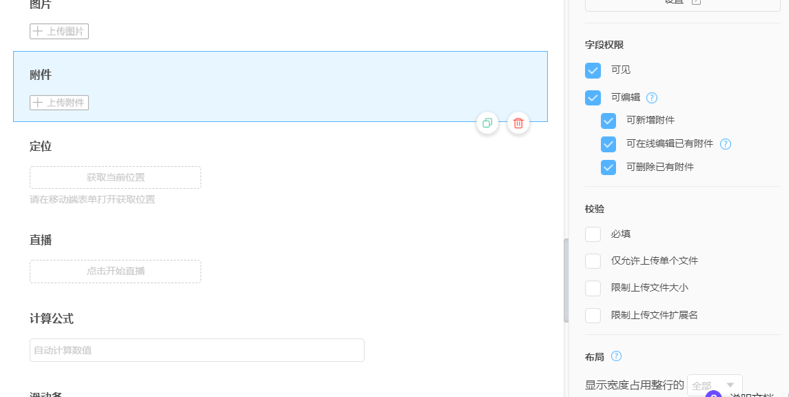 2.字段权限:可设置附件字段的可见可编辑权限,其中可编辑权限可具体到是否可新增、在线编辑或删除。