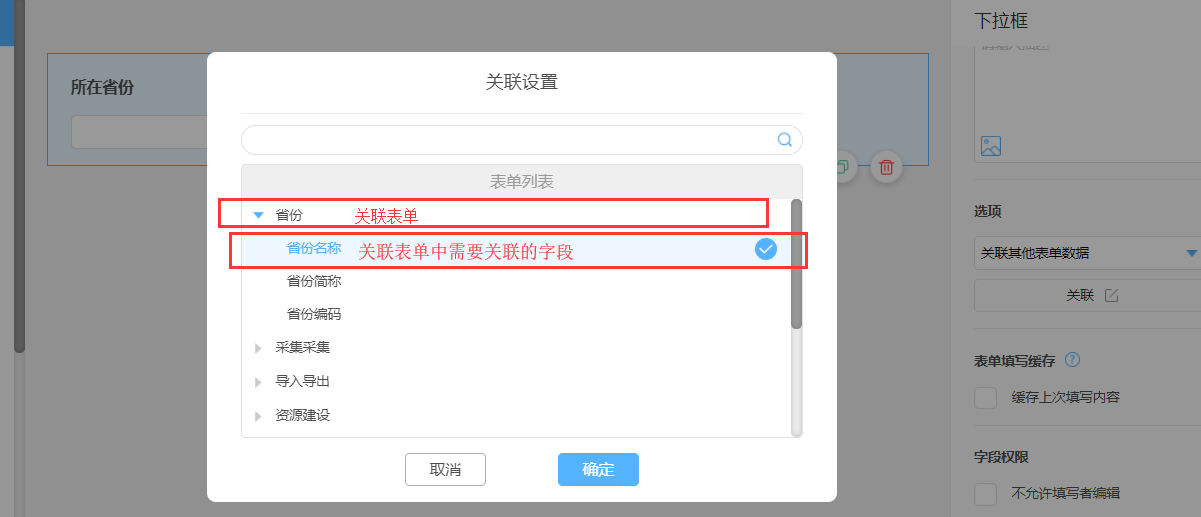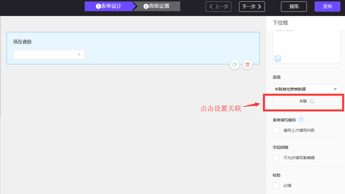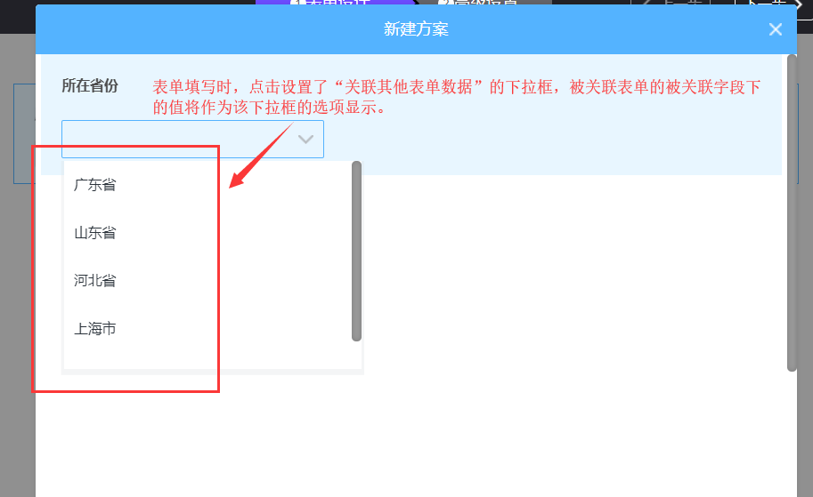 1.新建表单,“所在省份”下拉框,“选项”中选择“关联其他表单数据”:
