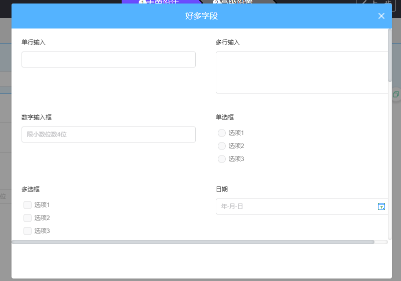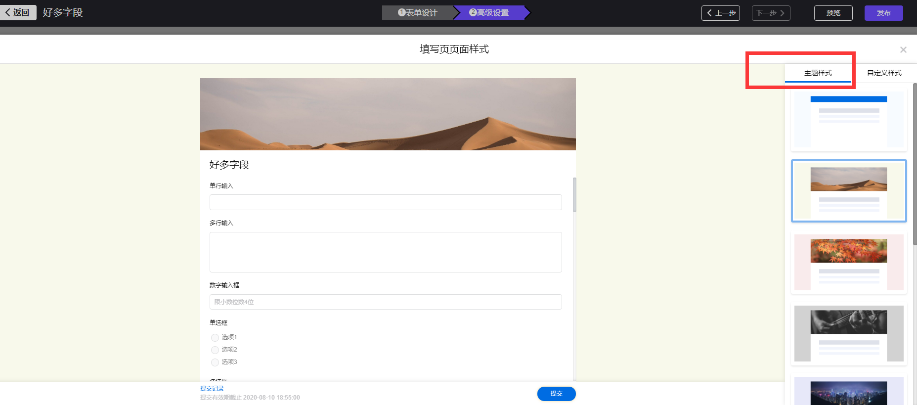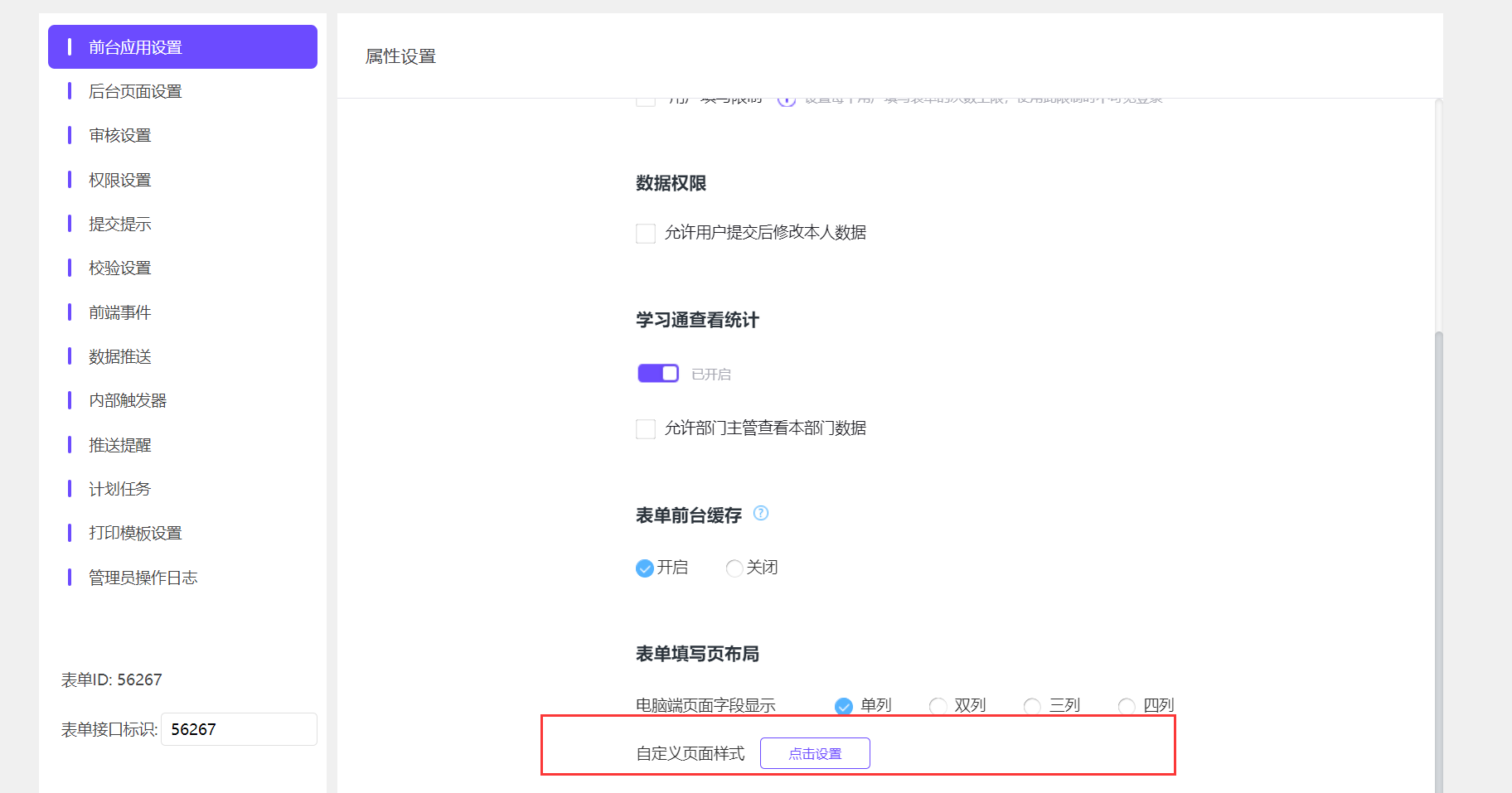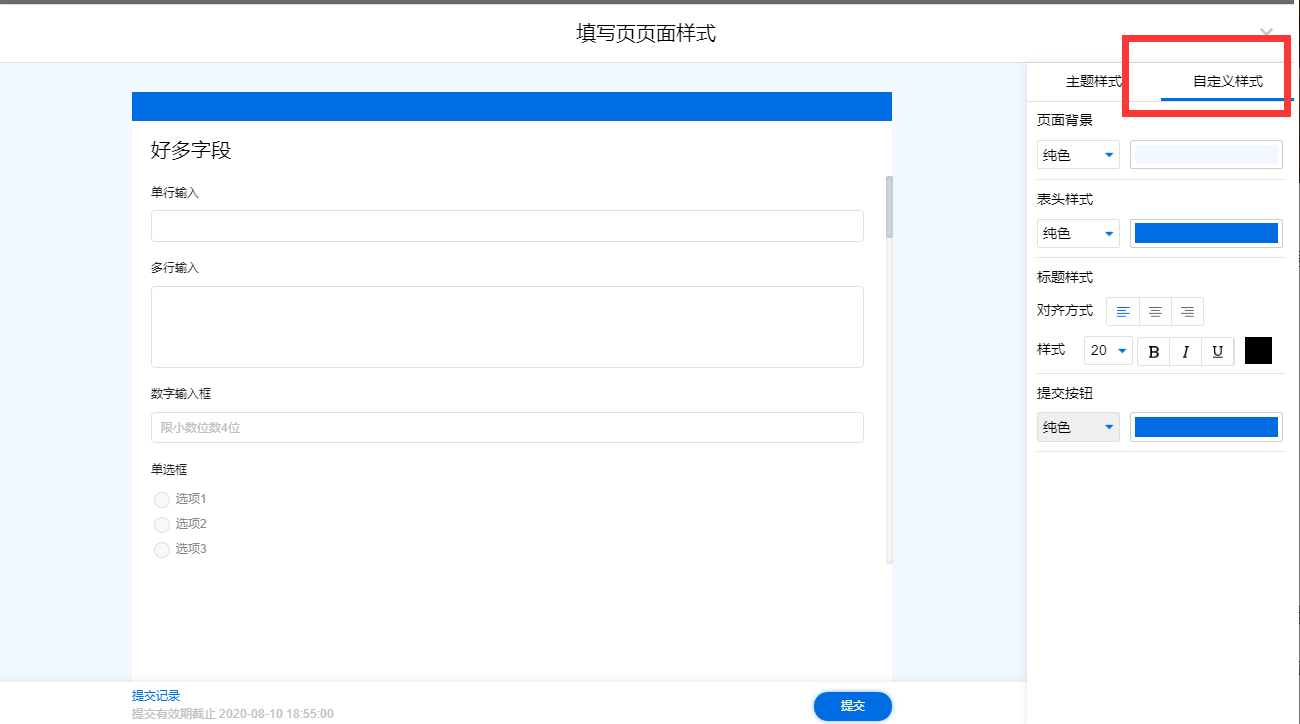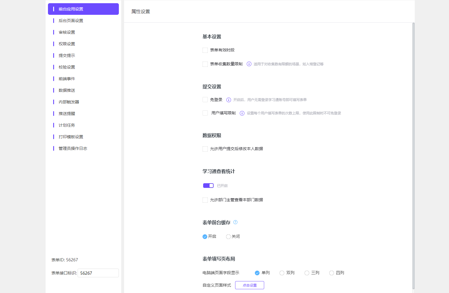 高级设置—前台应用设置:可对表单的有效时段、收集数量、用户填写次数上限、提交后是否允许用户修改以及是否允许部门主管查看本部门数据进行限制设置。可设置免登录填写。还可以设置电脑端表单填写页的布局(支持单列、双列、三列和四列),并支持自定义填写页样式。