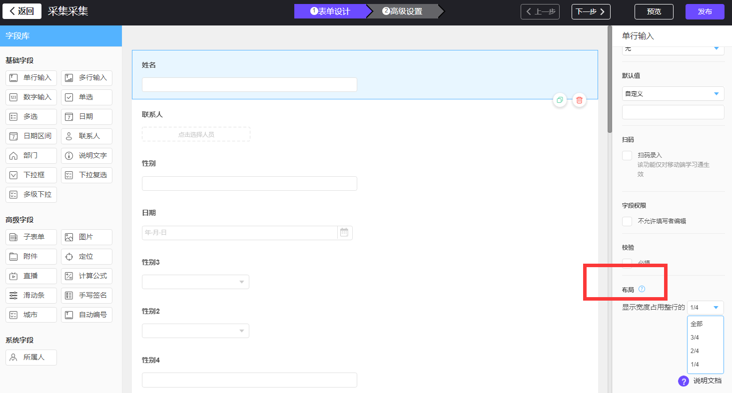 开启多列显示后,可以在表单字段属性设置中设置字段显示占用所在行的比例: