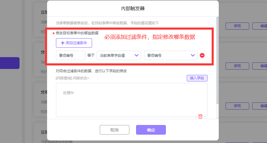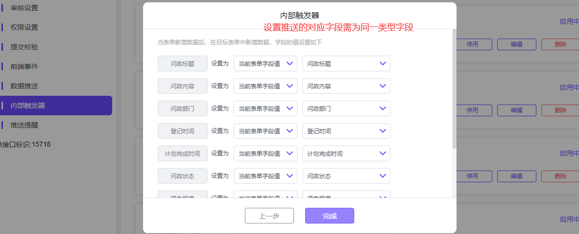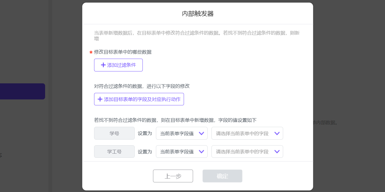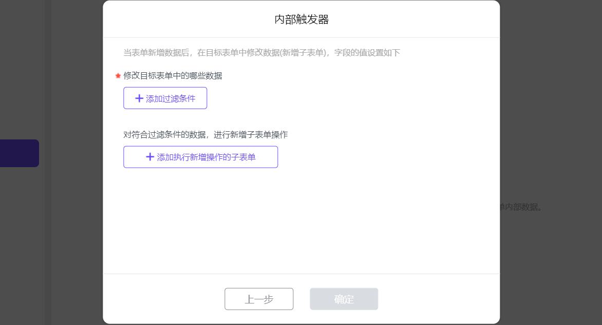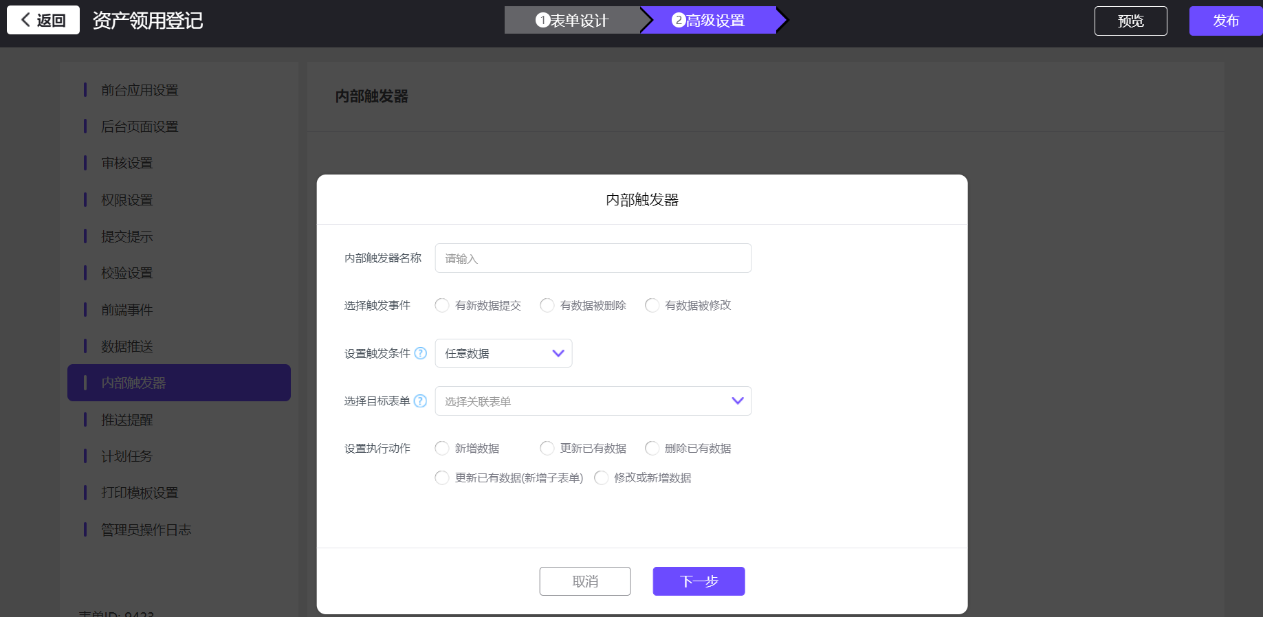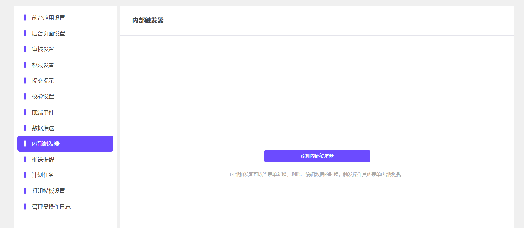 高级设置—内部触发器:当在一个表单新增、修改或删除数据后,可以设置自动在其他表单或审批中新增数据、将符合条件的数据修改为指定的值、或删除指定数据。