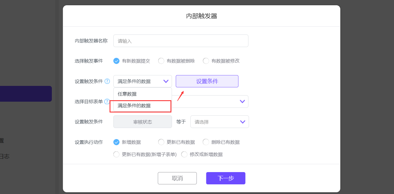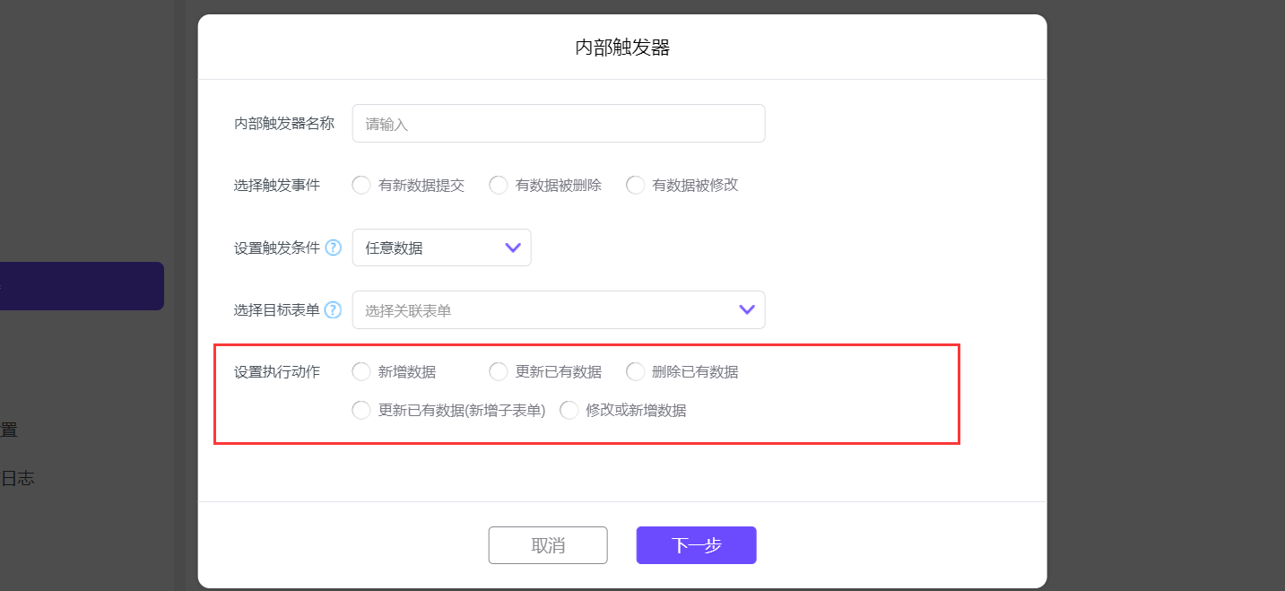 4.设置执行动作:可选择在目标表单中新增数据,更新已有数据,删除已有数据,新增子表单(需目标表单中已设置有相应的子表单字段),修改或新增数据(已有的修改、没有的新增)。根据不同的执行动作,在下一步中需要设置的项目将有所不同。