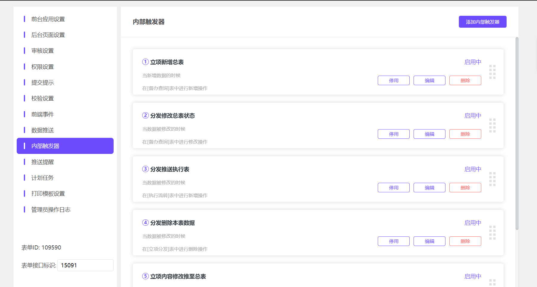 确定完成后,即可添加一条触发设置。可以添加多个内部触发器。 可以设置启用或停用单个触发器。可以拖动调整触发器的执行顺序。