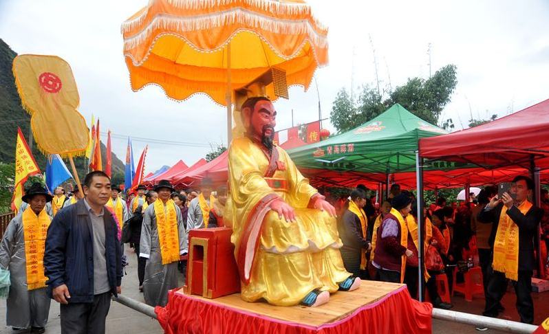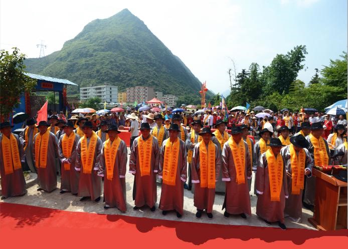 相传上古时期,中华民族的共同祖先舜帝南巡抵韶,北返时曾登上南岭最高峰。每年农历八月十二舜帝诞辰日,人们举行“圣祖祭”纪念舜帝诞辰公祭;八年十年举行一次“鸿朝”(醮);十几年甚至几十年举行一次“打幡”(大醮);并为刚去世的老人“做功德”,举行尊老爱幼的现场说教。“圣祖祭”以舜帝孝道精神为核心,以“孝”营造和谐、健康的社会氛围。