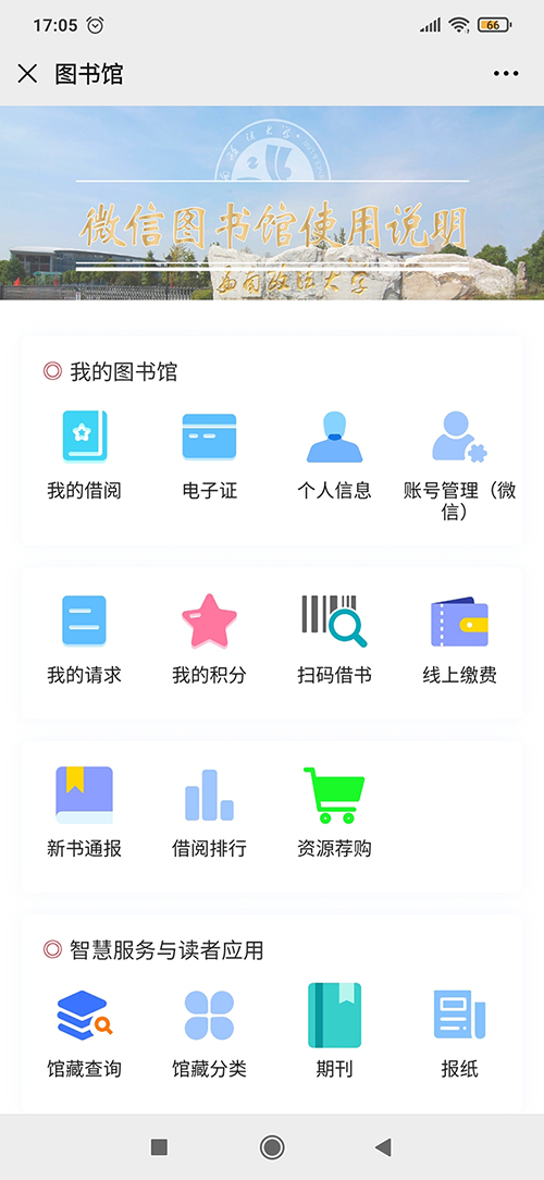 线上缴费:如果不慎产生图书超期使用费等费用,可以在此通过微信支付,或查看历史缴费信息。