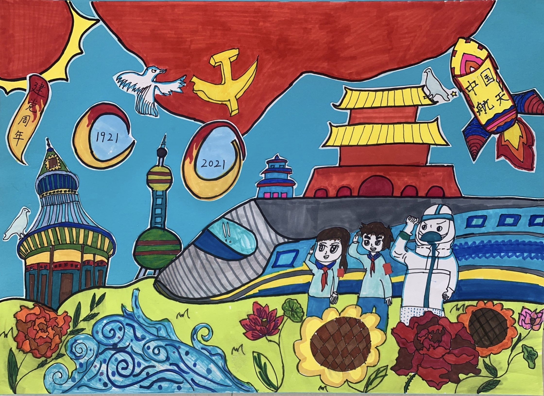 中国共产党成立到现在已经整整一百年了,中国日渐强大,山河灿烂!我跟妈妈观影《革命者》后,您在敌人的酷刑前临危不惧的形象浮现在我的眼前,您是中国共产主义运动先驱,您为了解救被压迫的人民,为了新中国寻求光明的道路,视死如归。在您的领导下,无数中华儿女前仆后继,终于推翻了黑暗的统治,迎来了光明的新中国。我多么想把这一切告诉您——
