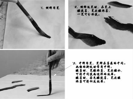 中锋用笔:笔杆与纸面垂直,见图12-1,注意醮墨时的变化,见图中文字说明。