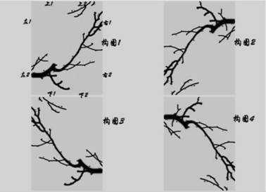 以一张四尺三开的画幅为例,将纸张的四边分别记为上、下、左、右四条边,如图12-7将上边插入两点,分别记为“上1”与“上2”,“下1”与“下2”。同样的方法可将左右两边均作如上的处理,可得“左1”与“左2”,“右1”与“右2”等点。梅花构图的基本要素是避免平行线的出现,如枝干与画边的平行,枝干与枝干的平行。基于此,如果以“左2”点作为枝干的入点,则枝干的出点可在“右1”,而在“上2”处添一些枝条作为辅助与陪衬得到构图1。上述方法是先确定梅的主干的走向,再增添一些辅助枝条的穿插,就可成为一幅简单的构图了。同样的方法,可将“右1”作为枝干的入点,“左2”作为枝干的出点可得构图2。同样的方法可得构图3与构图4。依照这种方法,大家可以自己设计不同形式的构图。但构图时要特别注意避免画面中的平均与对称现象,如线的平行、面的均衡对称等。