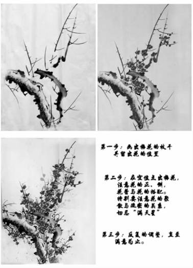 图12-6为梅花作画的全过程,先画梅的老干,再画大的枝干与新的枝条,并留下梅花的空位然后再在空位处画梅花。什么地方应当添枝加花是根据画面的发展和感觉而定的。