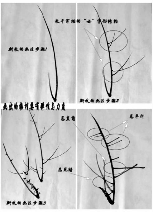 画新枝(梅鞭)时注意:梅的新枝多用中锋画出,画时注意笔的醮墨以求得墨色的变化。见图12-3中文字说明。