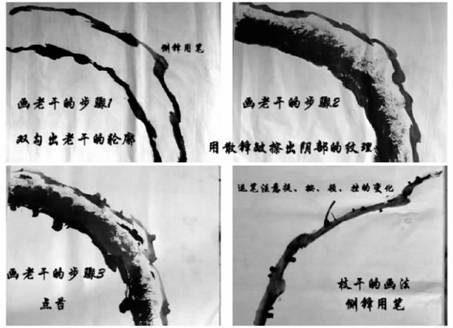 画枝干时注意:画大的枝干有多种方法,本书只介绍一种所谓的泼墨画法。方法是用大笔醮淡墨,笔尖醮浓墨,作画时笔尖对着下部的背光处,侧锋用笔,运笔过程中注意用笔的提、按、顿、挫的变化,然后一气呵成。