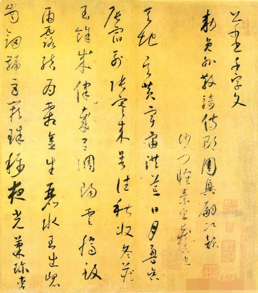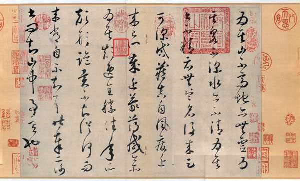 怀素草书,笔法瘦劲,飞动自然,如骤雨旋风,随手万变。他的书法虽率意颠逸,千变万化,而法度具备。怀素与张旭形成唐代书法双峰并峙的局面,也是中国草书史上两座高峰。