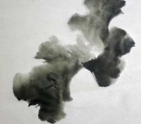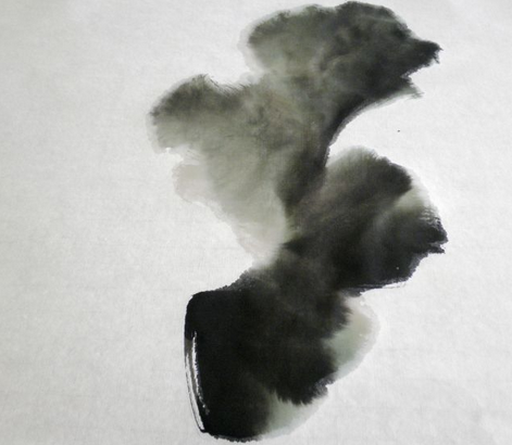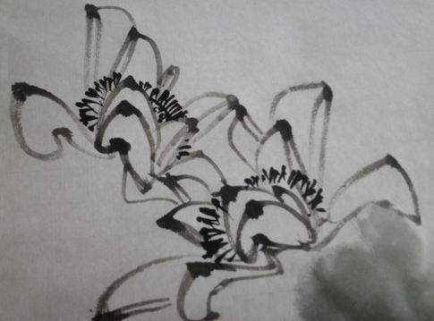 画叶选用硬毫大号斗笔或抓笔,笔上饱蘸墨,用泼墨法依叶子的形态分别从两侧边缘入笔向中间点垛,再用浓墨画出下边卷折部分的叶子。用墨上要突出浓、淡、干、湿的墨韵层次变化。笔法上概括为六个字,即戳、点、揉、拖、扫、擦。这六个字是互为关联,相辅相成的。起笔的第一笔即是戳点,“戳点”讲究点笔的力度,势如坠石。通过笔肚的下按使笔锋散开,随即用“揉”的方法延续或扩展叶块面。此时笔上的墨色已渐枯干,然后用“拖”的方法把笔拖向叶的中心,随之用渴笔散锋向同一方向“扫”去,再将笔侧卧,以“擦”的形式衔接浓淡之间的墨色变化,使两侧的叶中,湿笔的实和渴笔的虚相结合。用浓墨连接下边卷折部分和两侧部分,形成整体,其用笔亦是从左到右以不同宽窄、不同大小的块面几笔完成。叶子画好后半干时用稍重的墨色勾出叶筋,筋宜简不宜繁。