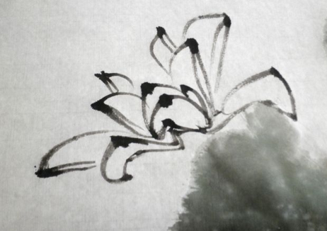 画荷箭即未展开的小叶,先用灰墨画两侧背面部分,再用浓墨点勾出两头露出的正面叶部分,最后用稍重的灰墨勾出叶筋。