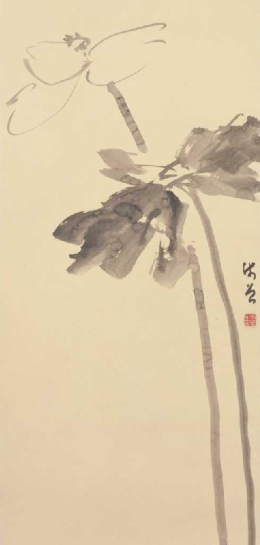 花的画法是意笔勾写,用硬毫勾线笔以侧锋淡墨渴笔勾出花瓣正反两侧的角度不同、大小高低不同的姿态,行笔要有粗细提按的虚实变化。淡墨勾好后再用焦墨于荷瓣尖部提加醒笔增强神韵。点蕊也用焦墨,蕊要高低错落,有聚有散,密而不乱。白莲用淡赭或淡汁绿分染,然后用浓淡不同的白粉点染。用浓藤黄蘸浓朱磦点染蕊,干后在正中部位用浓三绿点入两三点,以示蕊丝间显露出的莲蓬部分。红莲背面部分用浓朱磦蘸曙红点染,稍干后用浓胭脂丝写筋脉。正面部分用淡曙红点染,蕊色同于白莲。花蕾的勾写笔法同于花,先勾顶部一大瓣,随即勾出下面的两小瓣,染色方法同于花。