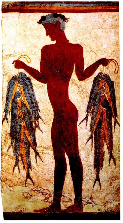 一位年轻的捕鱼人手里捏着捕获的海鱼。画面表现方法朴实、简洁。当时的爱琴海诸岛已与埃及、两河流域有一定的交往,因此在绘画上常常可见互相间的影响。这幅作品中人物的头和脚为侧面,人体的上半身与眼睛却是正面,无论人物的表情还是身上的曲线,我们都会觉得比严格遵守正面律的埃及壁画优美得多。