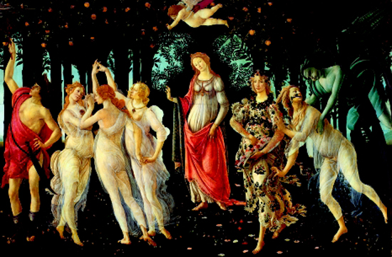 这幅作品描绘的是关于诞生与转变的主题。它通过不同人物的组合,描绘出一片生机盎然的意象,经历严寒的冬季,生命在此时焕发出动人的光辉。维纳斯在画面中,左手握住锦缎长袍,右手优雅地舒展伸出,邀请观者一同进入她的世界,这里不仅有女神与鲜花,也有生命之美唤起的欢愉。它让我们记住这句名言:“爱从美开始,终结于欢心。”