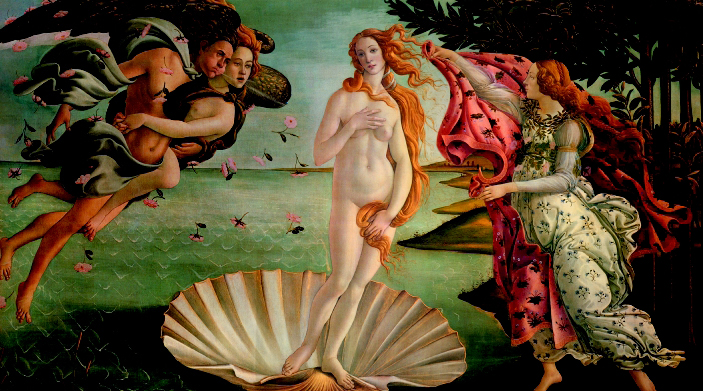 画面所表现的是西西里岛的一个美丽的传说:一片漂亮的大贝壳漂浮在碧波荡漾的海面上,上面站着纯洁而美丽的维纳斯,翱翔于天上的风神轻轻地将贝壳吹到岸边,等候在岸边的时辰女神正张开红色绣花斗篷,准备为维纳斯换上新装。娇艳的玫瑰花瓣从高处纷纷飘落,更给优美的画面增添了诗情画意。维纳斯身材修长,容貌秀美,双眼凝视着远方,眼神充满着幻想、迷惘与哀伤。