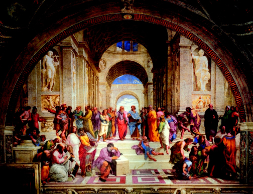 这是拉斐尔为梵蒂冈宫绘制的三幅巨型壁画之一,以古希腊哲学家柏拉图所建的雅典学院为题材,以古代包括语法、修辞、逻辑、数学、几何、音乐、天文在内的七种自由艺术为基础,弘扬了人类对智慧和真理的追求。画面上,古希腊以来著名哲学家和思想家汇聚一堂,有亚里士多德、苏格拉底、柏拉图、毕达哥拉斯等等。不同时代、不同地域和不同学派的著名学者,一起自由讨论,情绪热烈。全画背景为纵深展开的高大建筑拱门,拱门的中心透视点直通向遥远的天际。