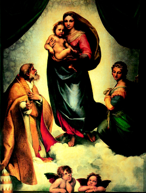 拉斐尔的圣母像分为两类,一类是人间母亲的形象,另一类以女王式圣母的形象出现。西斯廷圣母则是这两种圣母特征的结合,是画家理想中最完美的圣母形象。构图采用较稳定的金字塔形,刚刚揭开的绿色帷幕,圣洁美丽的圣母双脚赤裸,晶莹的双目注视着苦难的人间,怀中的耶稣瞪着两只眼睛等待圣母给他决断将来。