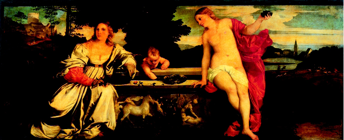 提香(1490~1576),生于意大利的卡多列,是威尼斯文艺复兴时期最伟大的画家。早年曾赴威尼斯学艺,与著名画家乔尔乔内是师兄弟,早期曾多有合作,深受乔尔乔内风格的影响。乔尔乔内去世后,他成为了威尼斯画派的领军人物。提香不断超越自我,在绘画上取得了极大的成就,特别是在用色方面有极高的造诣,他的绘画风格和用色技巧对西欧各国绘画艺术的发展都产生了深远的影响。他的作品很多,代表作有《天上的爱与人间的爱》、《圣母升天》、《基督下葬》、《酒神祭》等。