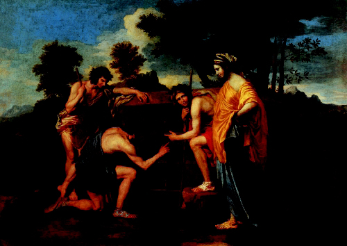 作品的背景是希腊阿尔卡迪地区。在古代,这是一个与世隔绝的地方,阿尔卡迪这一名称表示理想中的牧歌般的世外桃源。但即使在美丽的阿尔卡迪也无法逃避死亡。最初的作品中,牧羊人与其说是恐惧,莫妨说是以好奇心在研究坟墓。而这里则洋溢着更加庄严而冥想的气氛。