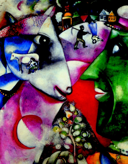 《我与村庄》是夏加尔初到巴黎的成名作。画面的背景是典型的俄国农舍和教堂的塔顶,里面有“我”、牝牛、开花的树等。这既是艺术家记忆中的故乡风景,也是他心灵中的故乡。画面采用了立体主义的分割法,所有的物象都被分割成了不同的形状组合在一起。一个人与乳牛的侧面脸庞构成了画面的主要组合部分,他们好像正在亲切对话,充满了温馨和默契的神态。