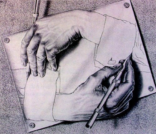 神奇的图形天才埃舍尔为我们创造了一个完全与众不同的绘画世界,《手画手》是他的代表性作品,画面上有两只手都正在执笔画画的手,初看平淡无奇,可是仔细看时,就会感以充满玄妙。