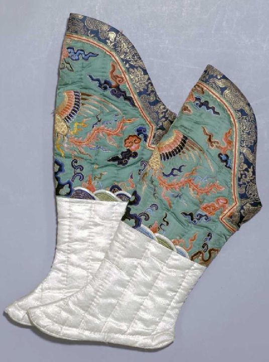 蓝色缎绣团凤绵袜,清康熙,长24cm,高46cm。清宫旧藏。