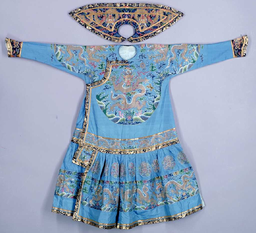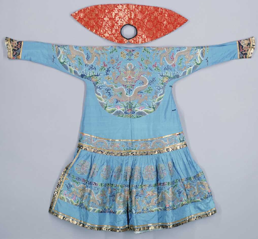 朝袍圆领,大襟右衽,马蹄袖,附披肩,裾左开。袍以二至四色晕的装饰方法在月白色纱地上彩织柿蒂形云龙纹及海水江崖等纹样。领袖边饰石青色四合如意花卉织金缎及三色平金边。袍内饰湖色团龙杂宝纹实地纱里,披肩里为红色团龙杂宝织金绸。领襟缀铜鎏金錾花扣五,披肩扣一。