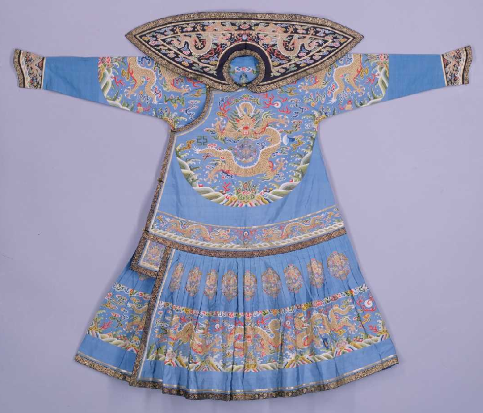 据清代典制,此月白色朝袍为皇帝于秋分祭月时所穿的礼服。