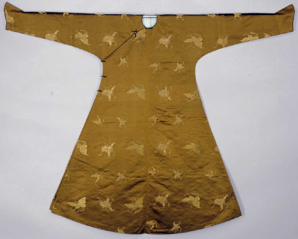 此为清代后妃常服。此袍拈金匀细,金质光亮,为清乾隆朝江宁织造局的织金缎佳品。