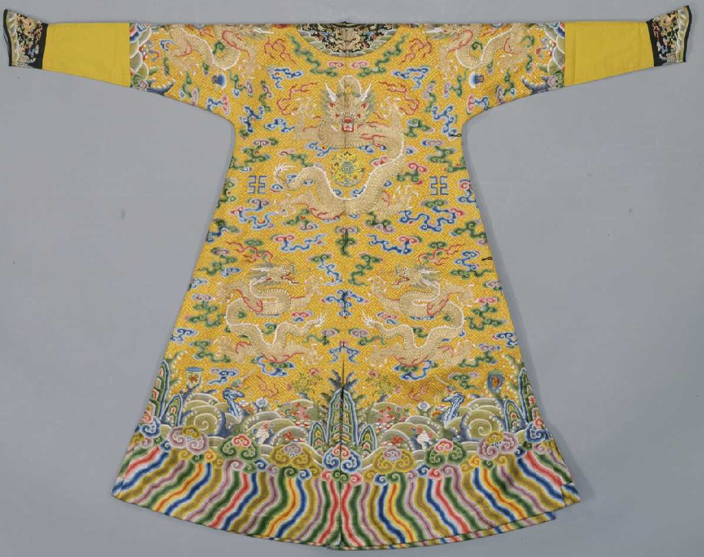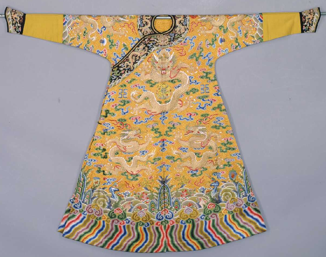 黄纱绣彩云金龙单龙袍,清乾隆,身长144cm,两袖通长192cm,袖口宽16cm,下摆宽126cm,左右裾长24cm,前后裾长52cm。清宫旧藏。