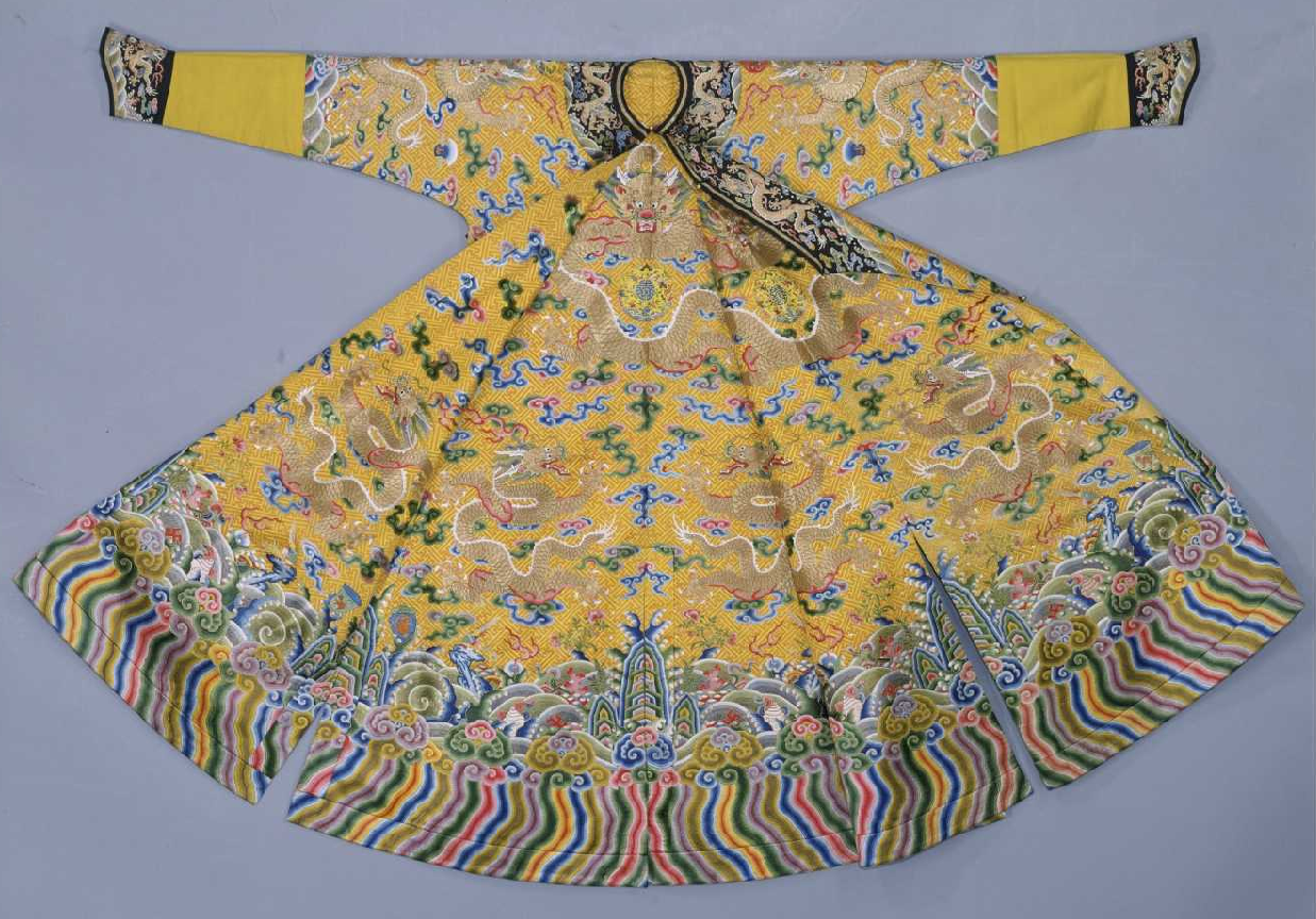 此为清朝皇帝吉服。附黄条,上墨书:“绣黄实地纱”(残断);“高宗”;“用不得”。