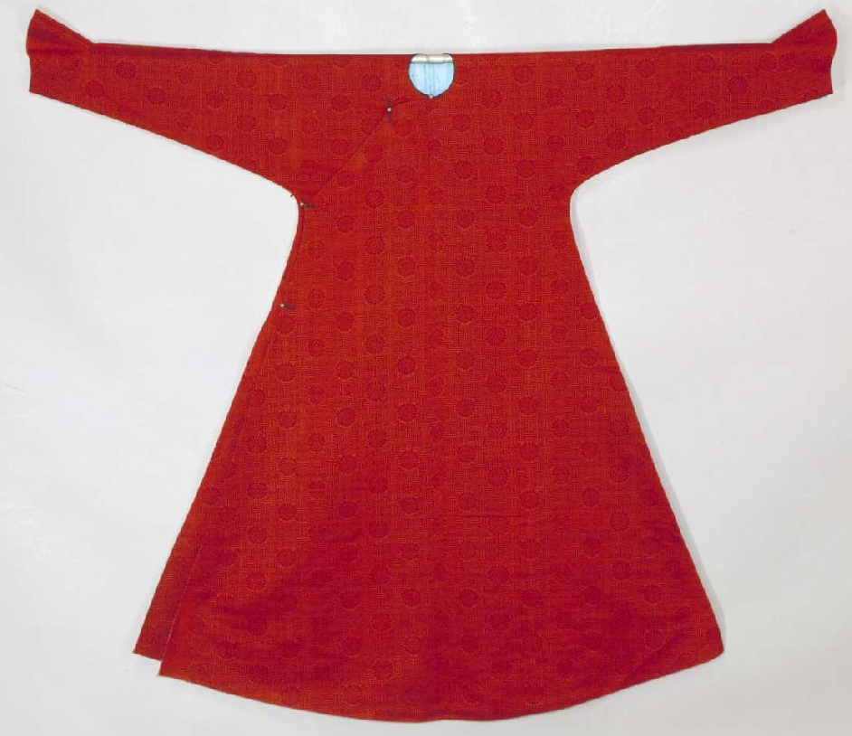枣红色万字菊纹漳缎袷袍,清嘉庆,身长148cm,两袖通长180cm,袖口宽19cm,下摆宽127cm,左右裾长80cm。清宫旧藏。