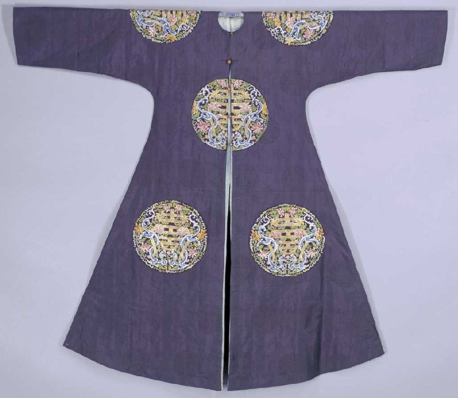 据《大清会典》规定,这种女用吉服褂是以不同的纹样来辨别等级的高低。此褂饰八团双夔拱寿纹,较后妃吉服褂所用纹样“两肩前后正龙各一,襟行龙四”、嫔吉服褂所用纹样“两肩前后正龙各一,襟夔龙四”及皇子福晋吉服褂所用纹样“五爪正龙四团,两肩前后各一”的等级为低,系皇孙福晋穿用的吉服褂,穿于吉服袍之外。