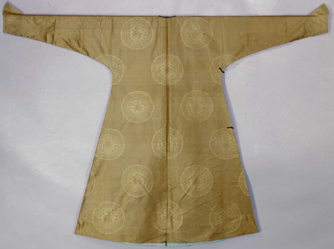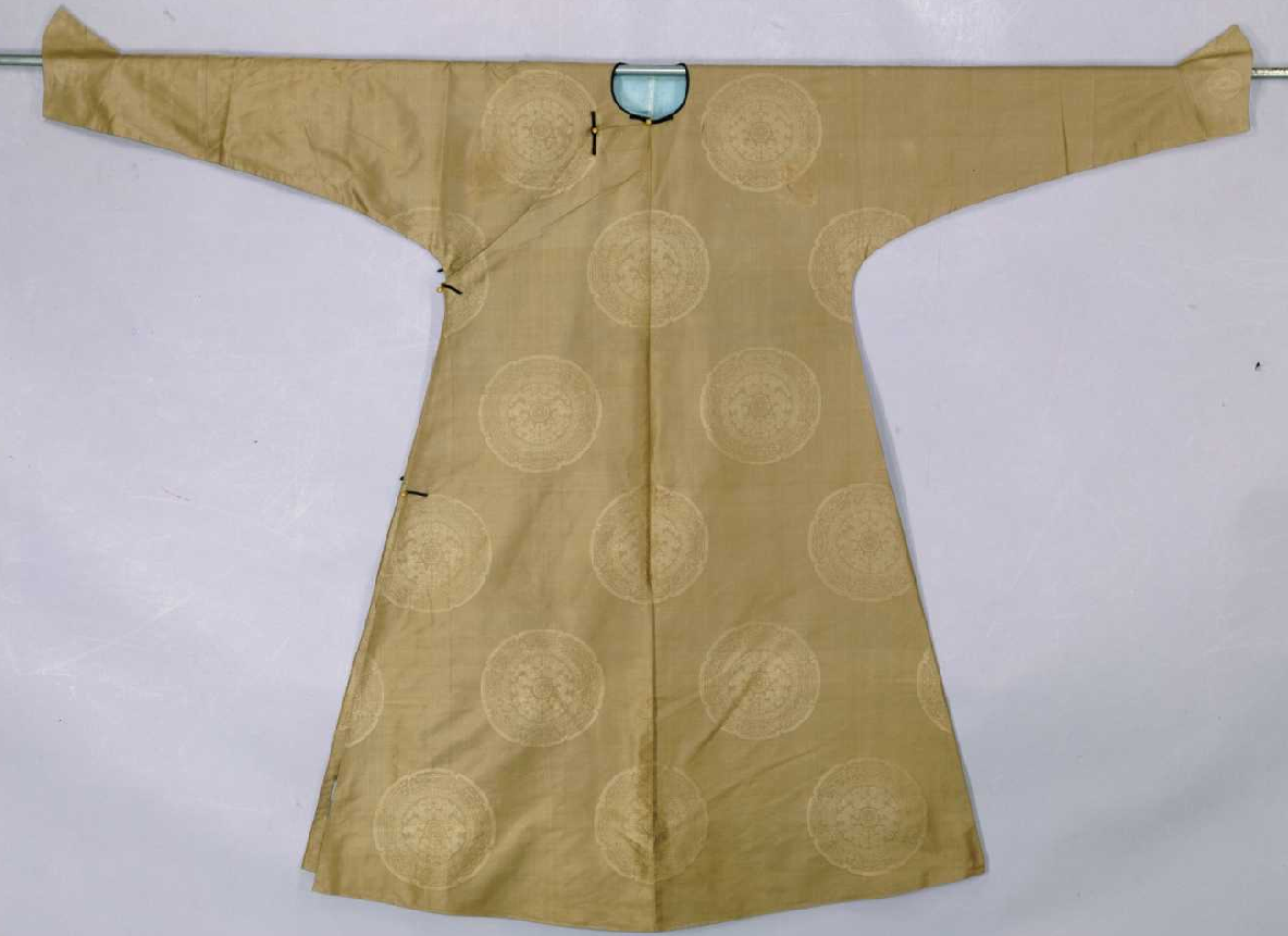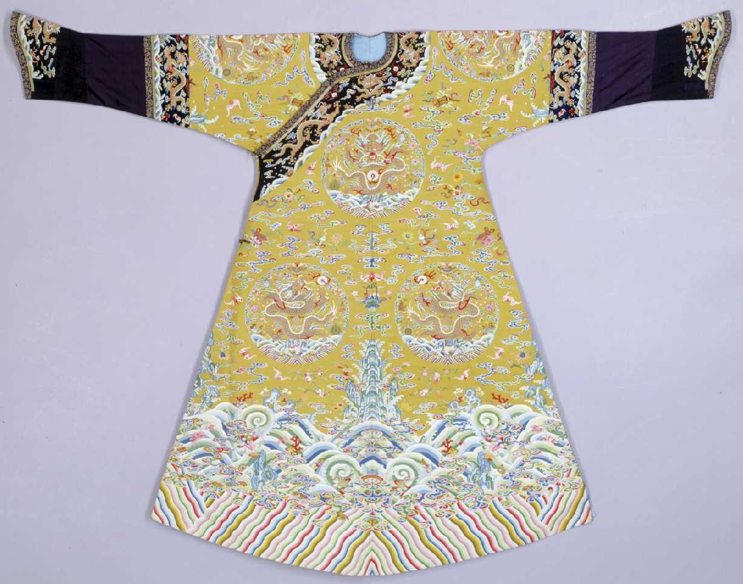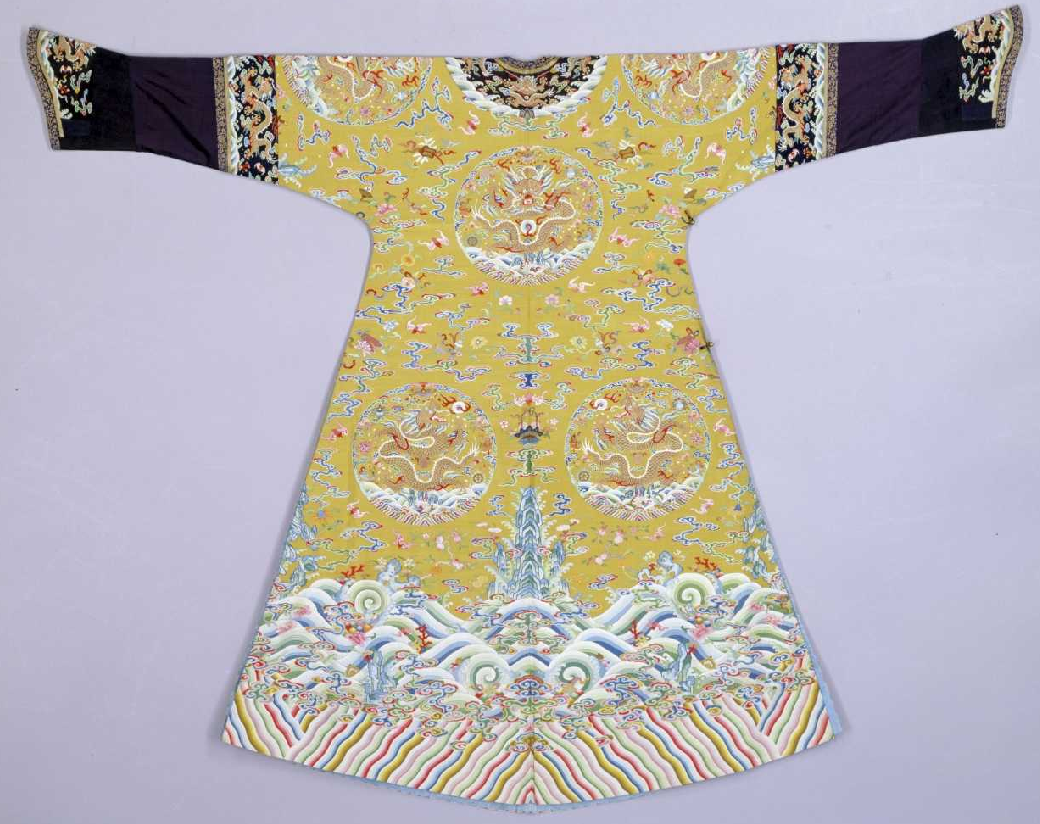香色缂丝八团云龙袷袍,清嘉庆,身长140cm,两袖通长186cm,袖口宽24cm,下摆宽112cm,左右裾长79cm。清宫旧藏。