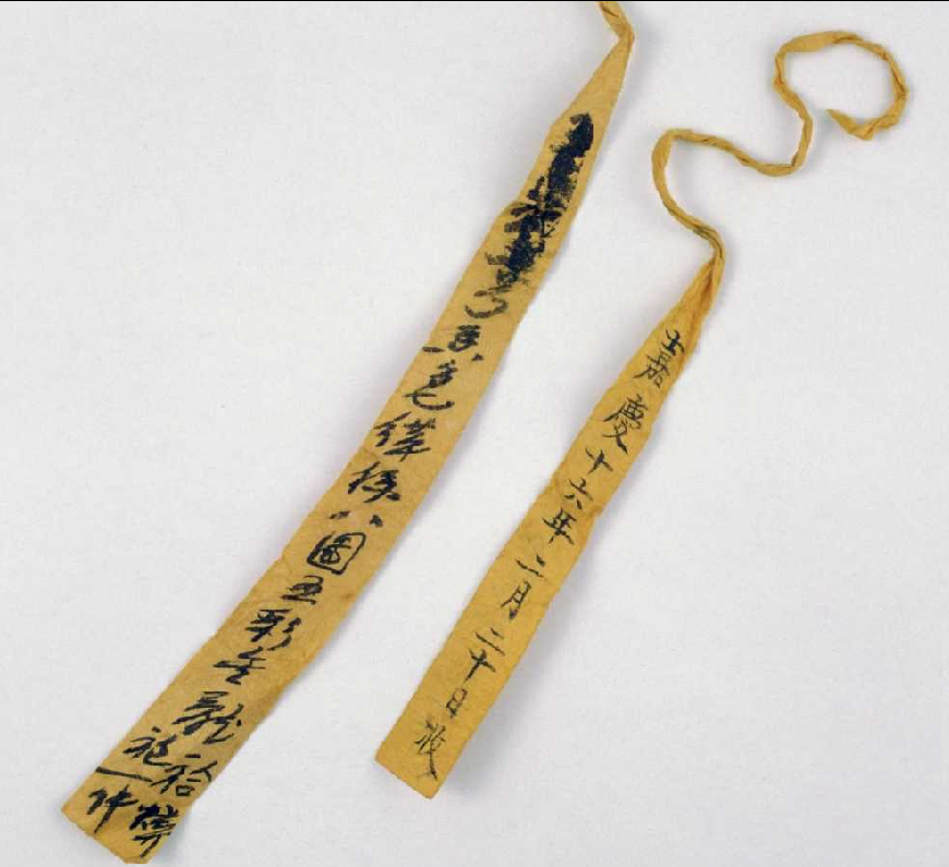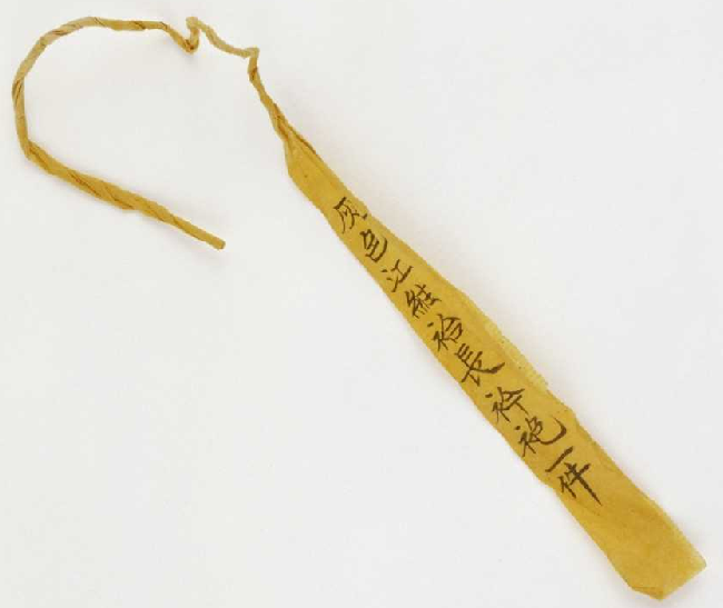 领口系黄条,上墨书:“香色缂丝八团金龙袍一件”,“嘉庆十六年二月二十日收”。