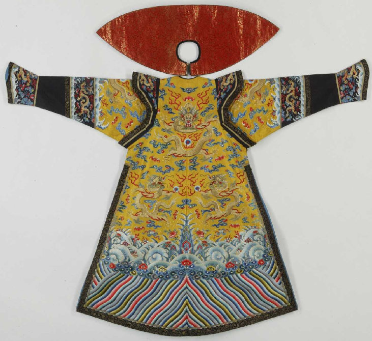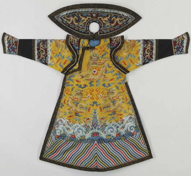 此为清代皇后或皇太后春秋礼服之一,圆领、大襟右衽,左右开裾,马蹄袖,附披领直身式袍。明黄色实地纱面,湖色团龙纹实地纱里,镶石青色缠枝勾莲纹织金缎边。通身以套针、平金、齐针、滚针、钉针等技法绣彩云金龙纹,间饰牡丹、菊花,下摆八宝平水。前后两肩正龙各一、左右护肩缘行龙各一,下摆前后行龙各二,里襟行龙二,中接袖行龙各二,马蹄袖端正龙各二,披领正龙二。此袍绣工精美,纹样富丽,尽显皇后母仪天下的华贵气宇和尊崇地位。