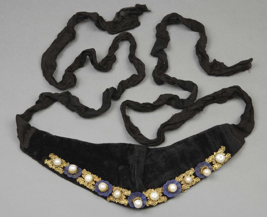 青绒银镀金嵌珠石头箍,清嘉庆,长25cm,宽3—7.5cm。清宫旧藏。