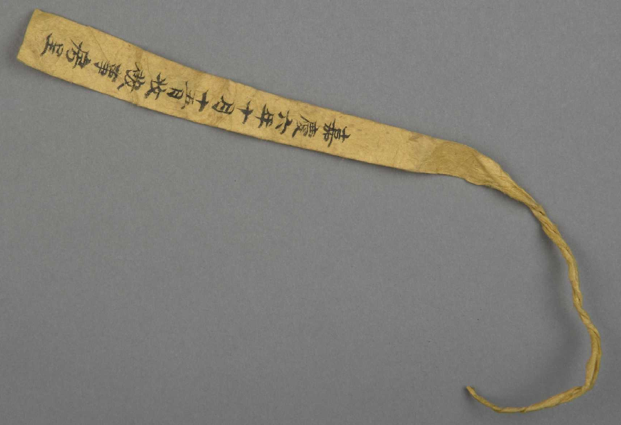 此头箍为皇后着吉服时佩戴于钿子之下,可起到约发和装饰的作用。附黄纸签,其上墨书:“嘉庆六年十月十五日收,敬事房呈,览银镀金花托六块玻璃花托五块嵌假珠十一颗。”