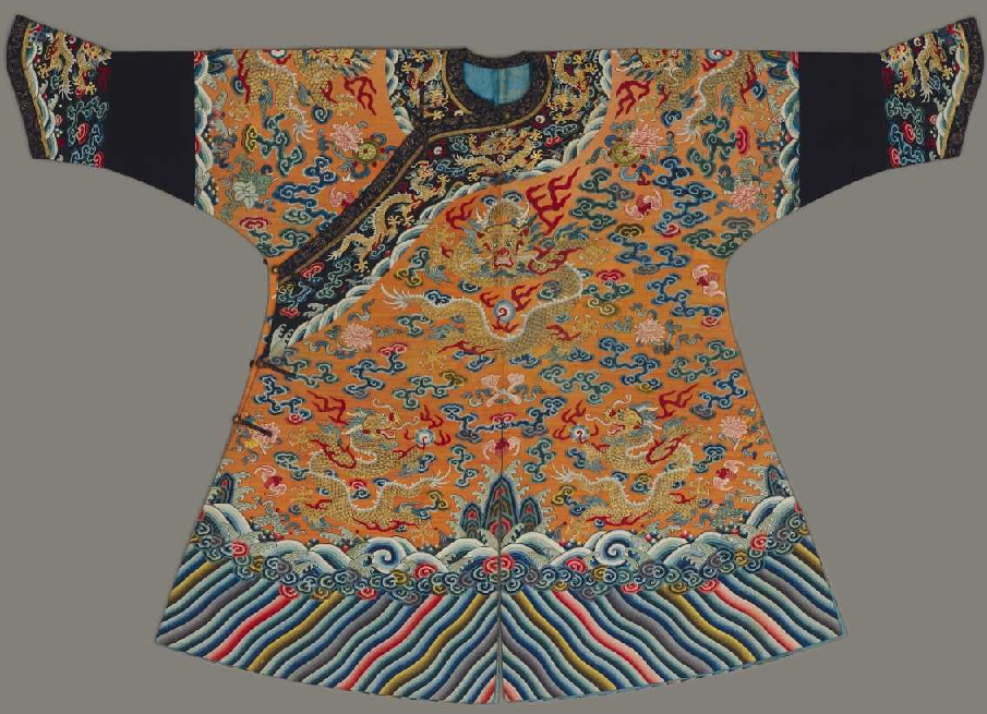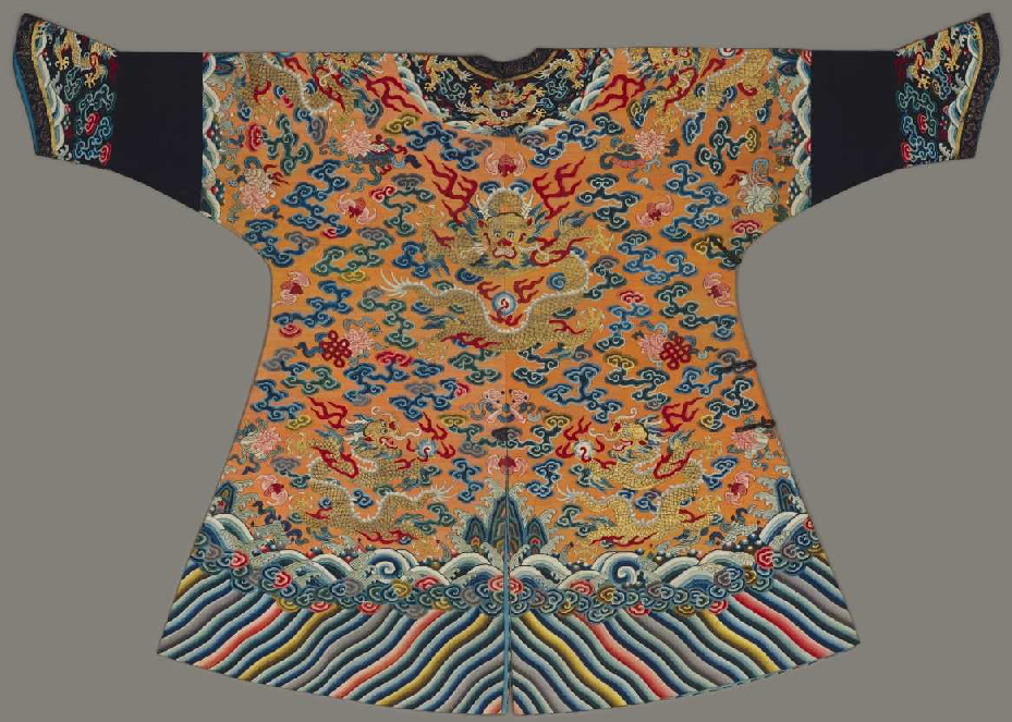 此袍在杏黄地上,缂织彩云金龙及海水江牙等纹样,工艺细腻,一丝不苟。清代冠服制度向以森严繁复著称,从服装的颜色、纹样、形式和称谓上,都能表明穿着者身份地位的不同,即便是皇帝家庭之内也有着严格的等级区别。如吉服袍惟有穿在帝、后、妃、嫔身上,才可称龙袍。而皇子穿用的吉服袍,尽管与前者纹样或颜色相同,却只能称作蟒袍。
