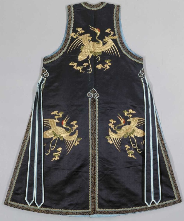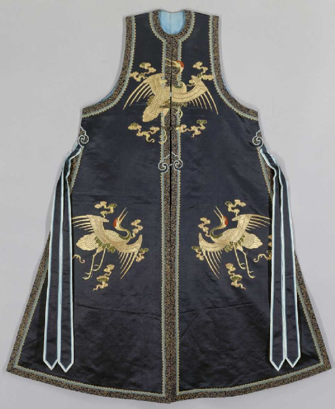 此坎肩为后妃便服。其工艺考究,且不局限于传统刺绣的晕色方法,用混色线和孔雀羽对仙鹤的眼睑等处进行装饰,风格新颖,更显其珍贵。