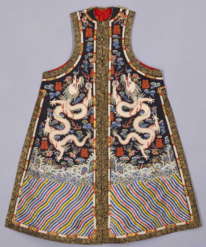 石青色绸绣缉米珠云龙双喜字纹绵朝褂,清道光,身长139cm,肩宽40cm,下摆宽122cm,左右开裾长83cm。清宫旧藏。