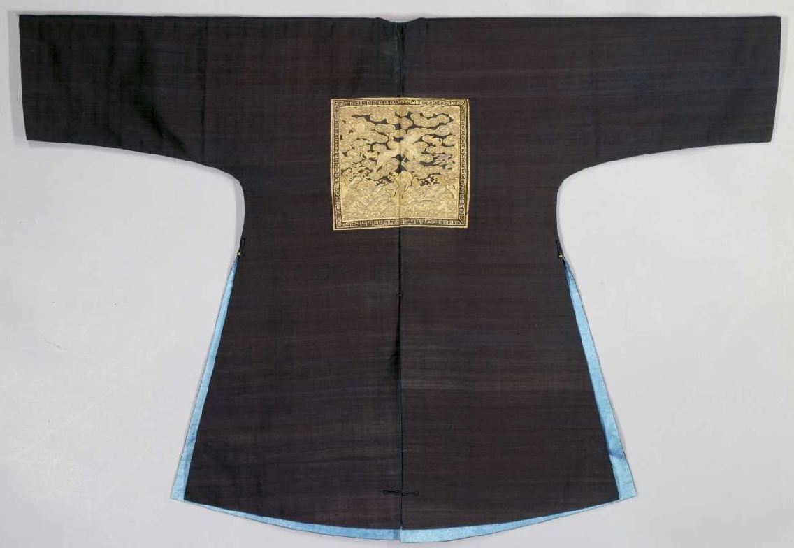 石青地缂金文一品补服,清道光,身长117cm,两袖通长166cm,袖口宽29cm,下摆宽106cm,左右裾长70cm。清宫旧藏。