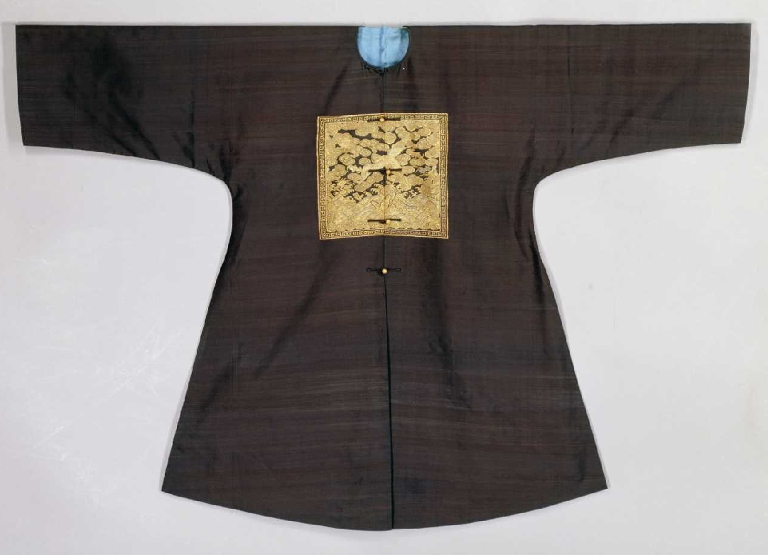 补服圆领,对襟,平袖端,裾左右开。前胸后背饰缂金方补,月白色小朵暗花绫里。左右开裾上端铜镀金錾花扣各1枚,后裾下部扣鼻2枚,便于骑坐时掀起衣襟。补服为石青色地,在前胸后背用三色圆金线缂织仙鹤,云水回纹边。三色金线捻制极细,织造细密。