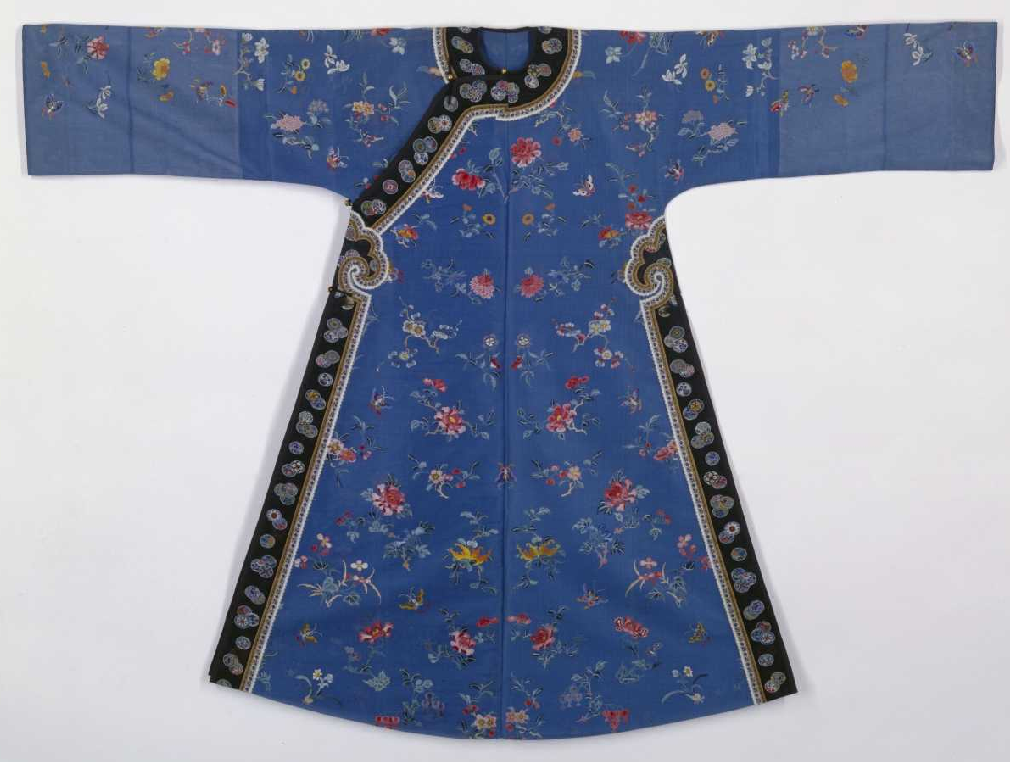 此衣丝质,是清代后妃夏日穿着的一种直身常式服,其式为:圆领,大衿右衽,平式挽折袖,内衬白色暗八仙实地纱,外翻及肘作多层状,裾左右开,缀铜鎏金錾水纹扣四。领口处系墨书黄纸签二,其一为“月白直纱绣花卉单ꘑ衣一件,同治二年五月十七日收,沈魁交”,其二为“月白直径地纳纱花卉ꘑ衣一件”。